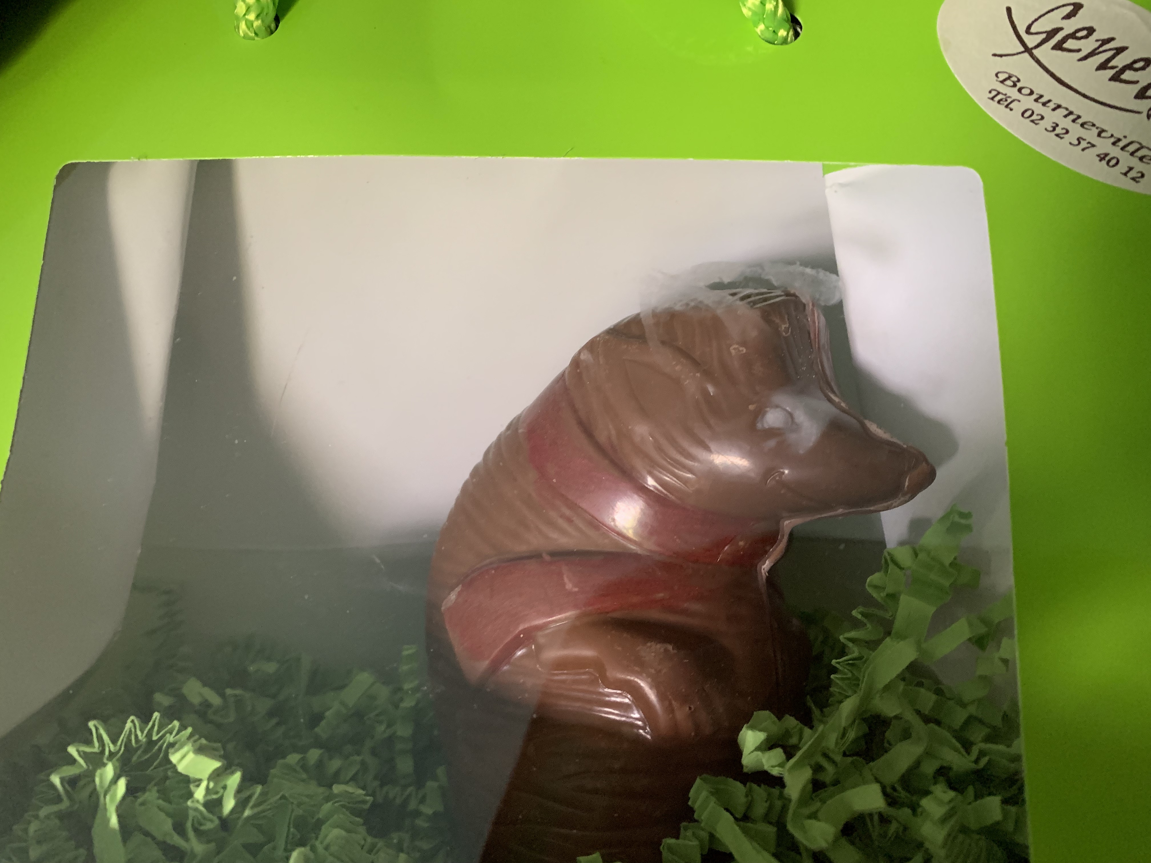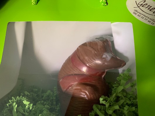 This charming hedgehog – herisson- nestling in his bag of grass from our local boulanger-turned-chocolatier for Easter.