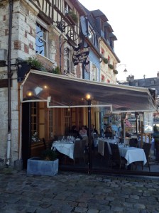 Today Honfleur attracts many tourists in the summer months. We have visited only in spring and fall, when it buzzes gently with weekending couples, and there’s enough watery sun shining for the restauranteurs around the rectangular harbour to keep a few tables outside.