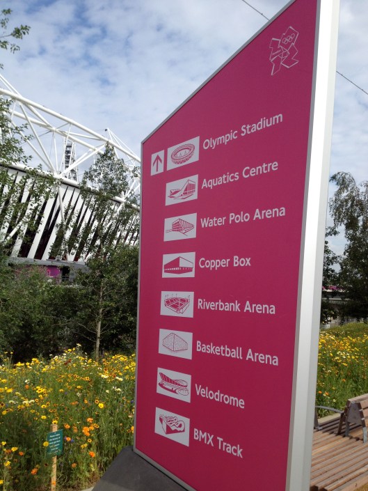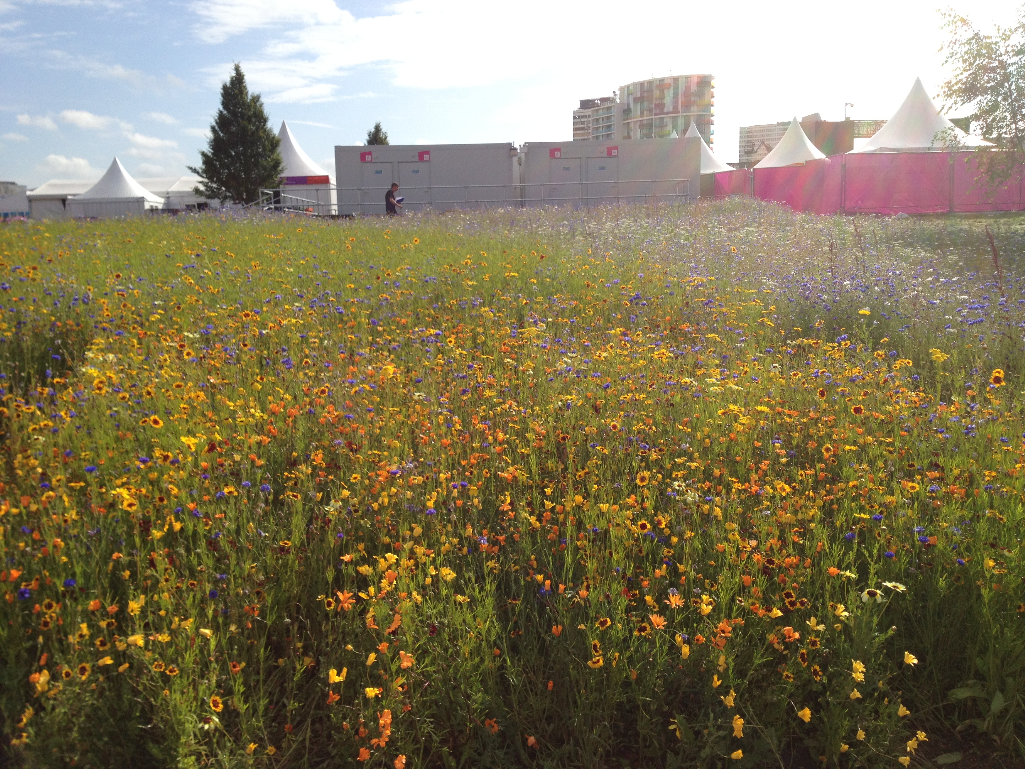 How different it looked from last time we saw it, just three months ago. One of the great surprises of the Olympic Park is just how attractive it is. Banks of wildflowers shimmered everywhere in the early morning light. Redolent of the golden colour you see sometimes in Normandy.